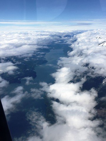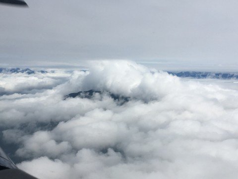 Eventually patience paid off! A real blue hole in the sky developed, and I did not delay the take off. By 5000’ I was well on top of all cloud layers and headed Northbound.